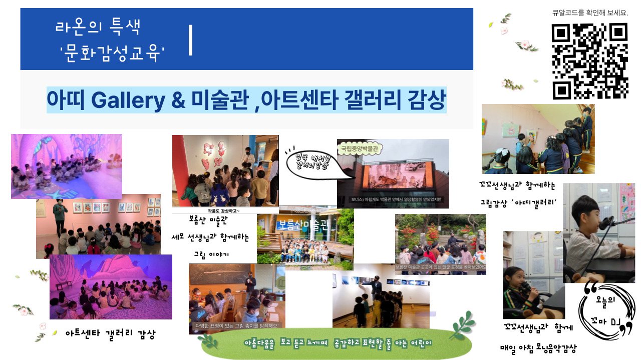 라온유치원 교육과정과 생활이 궁금하신 분들은 첨부 이미지의 큐알코드를 스캔하여 라온이야기를 들어주시면 됩니다.